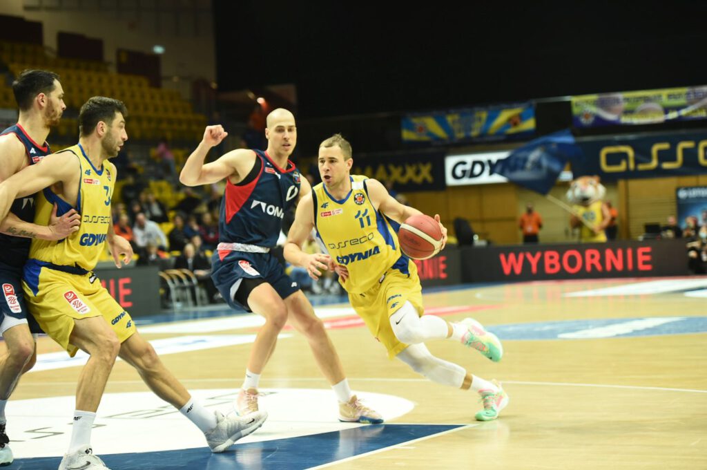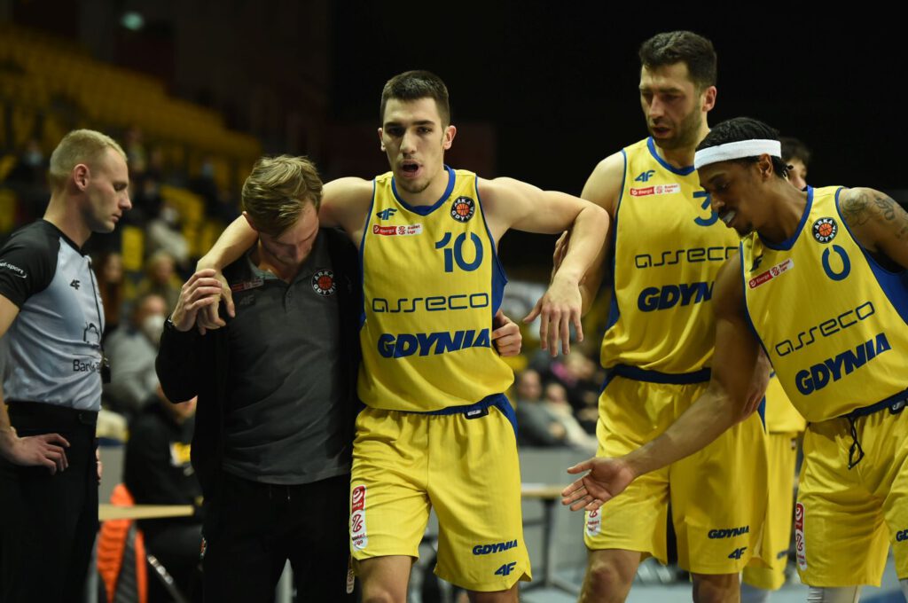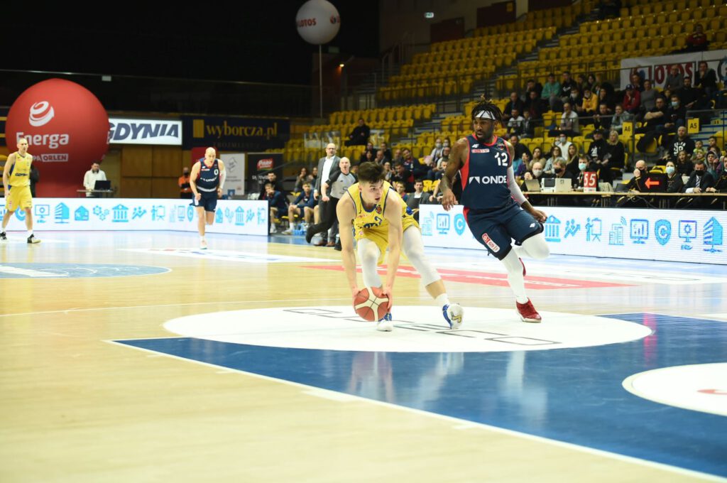 Początek spotkania był dość wyrównany, a kibice mogli oglądać pojedynek strzelecki Dominika Wilczka z Jahennsem Manigatem. Po późniejszej akcji 2+1 Daniela Amigo i zagraniu Aarona Cela goście uciekali na osiem punktów. Straty zmniejszali Adam Hrycaniuk oraz Jacobi Boykins – dzięki jego trójce z 11 metrów po 10 minutach było już tylko 29:30. Na niespełna trzy minuty przed końcem kwarty gdyński zespół stracił swój „motor napędowy”, jak określił trener Milos Mitrović Novaka Musicia, który z grymasem bólu na twarzy został sprowadzony z parkietu.
