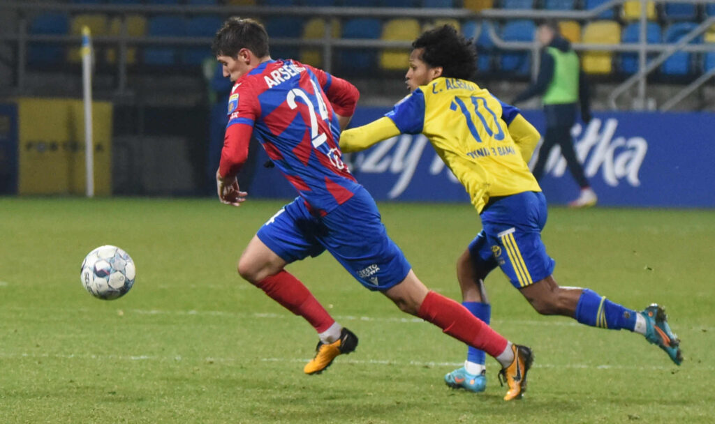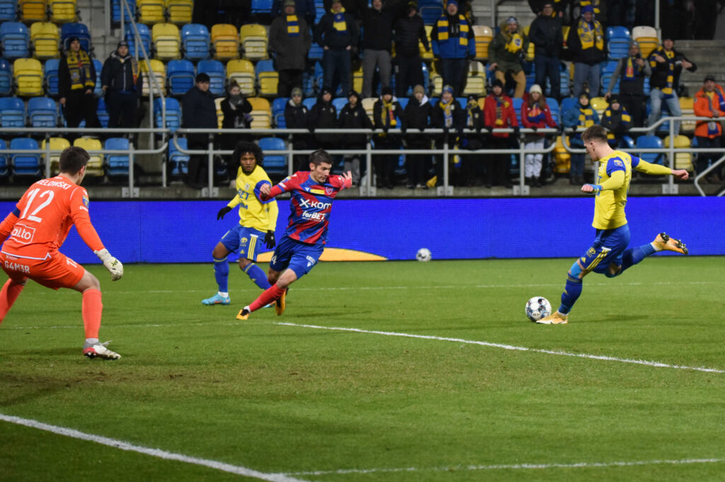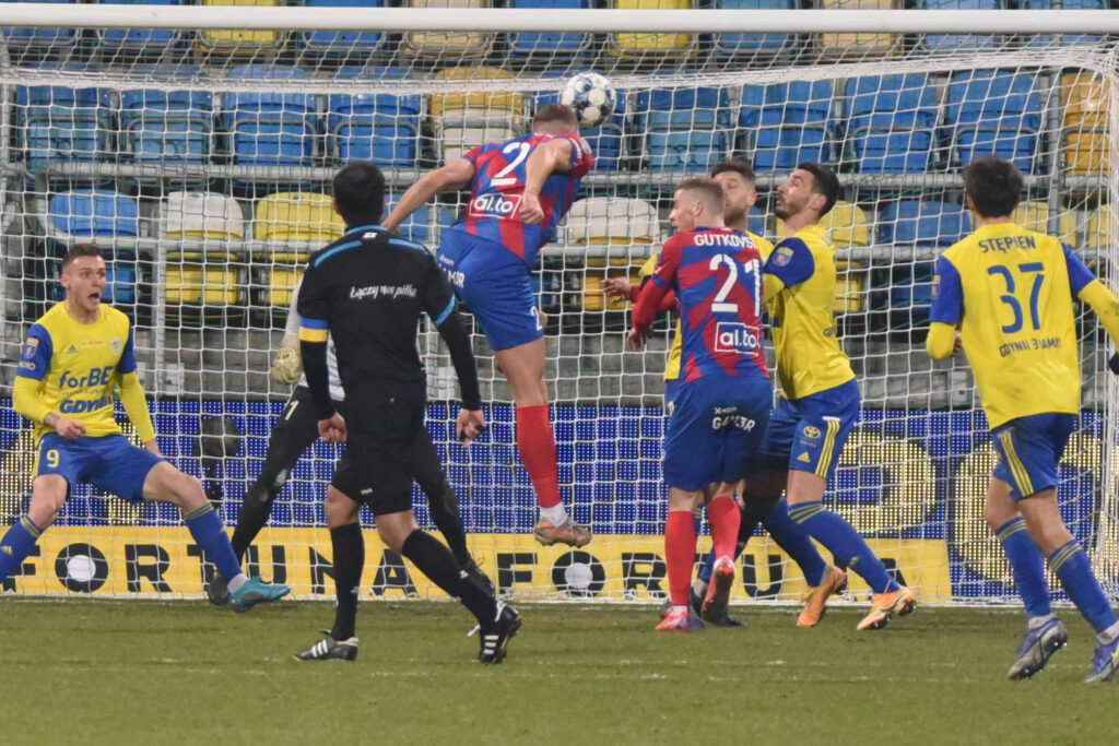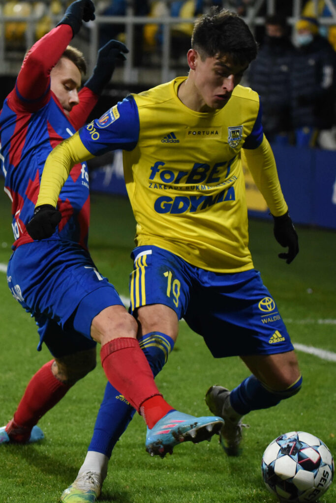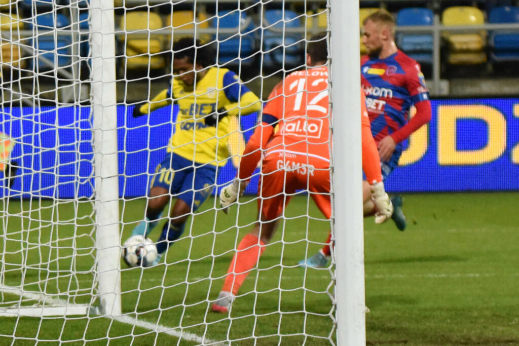 Dzisiejsze starcie zaczęło się rewelacyjnie. Już w czwartej minucie bowiem piłka za sprawą Karola Czubaka (zdjęcie górne) zatrzepotała w bramce Kacpra Trelowskiego. Niestety, radość gdynian szybko zmąciła decyzja sędziów, którzy stwierdzili, że przy podaniu Christiana Alemana napastnik Arki był na pozycji spalonej, choć to właśnie Czubak zaatakował bramkarza i wymusił jego błąd, powodujący całą sytuację. Goście odpowiedzieli niemal natychmiast, Ivi Lopez kapitalnie uderzył z dystansu, lecz kapitalną interwencją wykazał się Kacper Krzepisz.