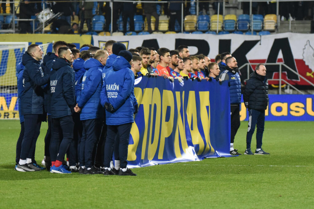 Przed meczem tradycyjnie już piłkarze obu drużyn zademonstrowali solidarność z objętą wojną Ukrainą. Na koszulkach zawodników Arki (w barwach podobnych do ukraińskich) u dołu pleców można było przeczytać napis w języku ukraińskim: „Gdynia z Wami!” Antywojenne nastroje udzieliły się też kibicom, którzy wywiesili transparent, w którym dali wyraz swojego stosunku do przywódcy Rosji. Jego osoba stała się także obiektem kibicowskich niewybrednych haseł i przyśpiewek.