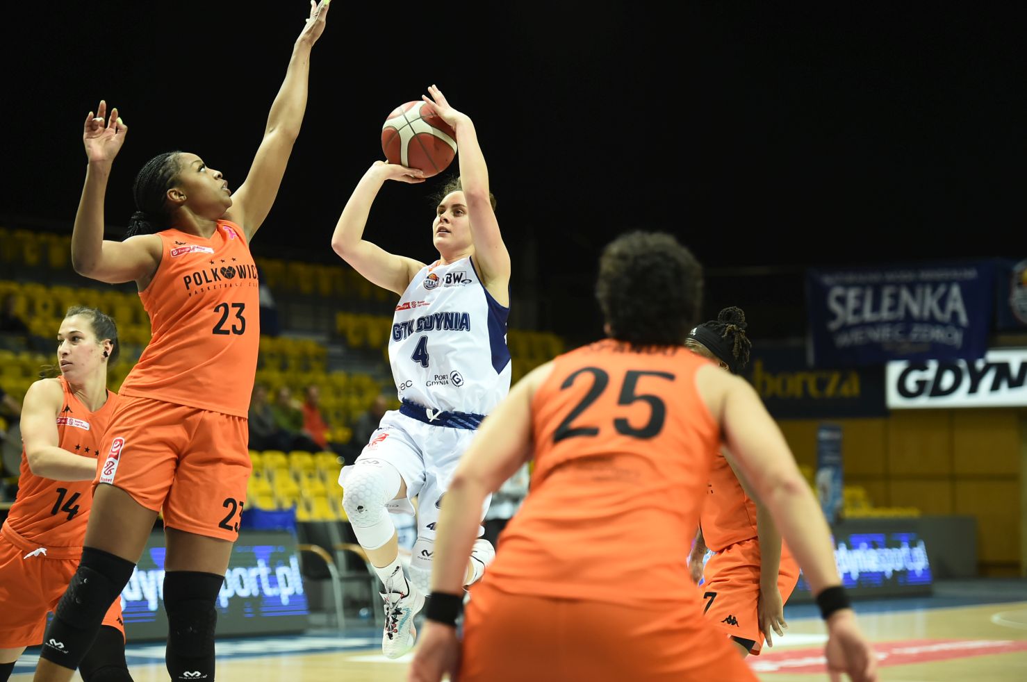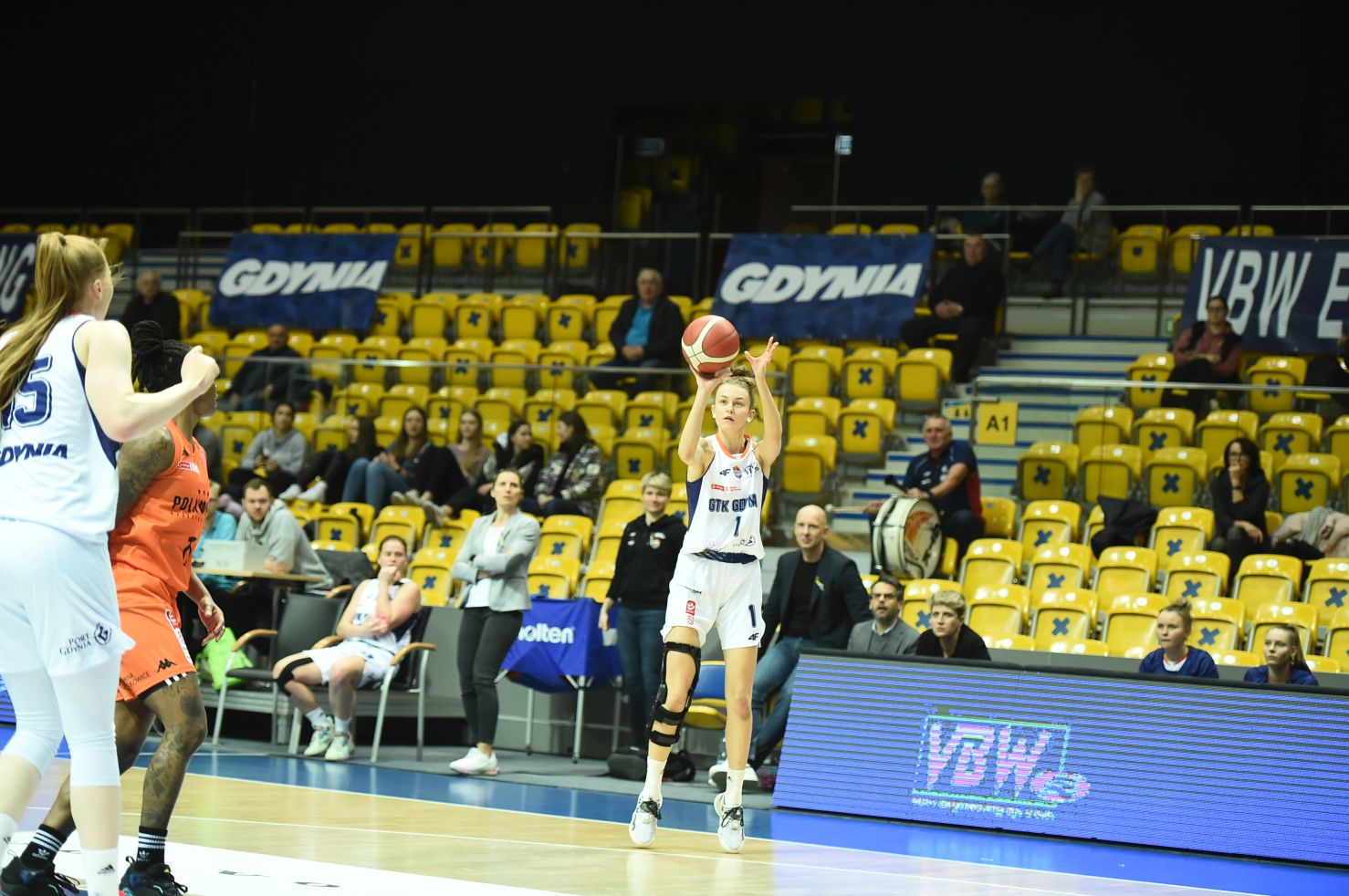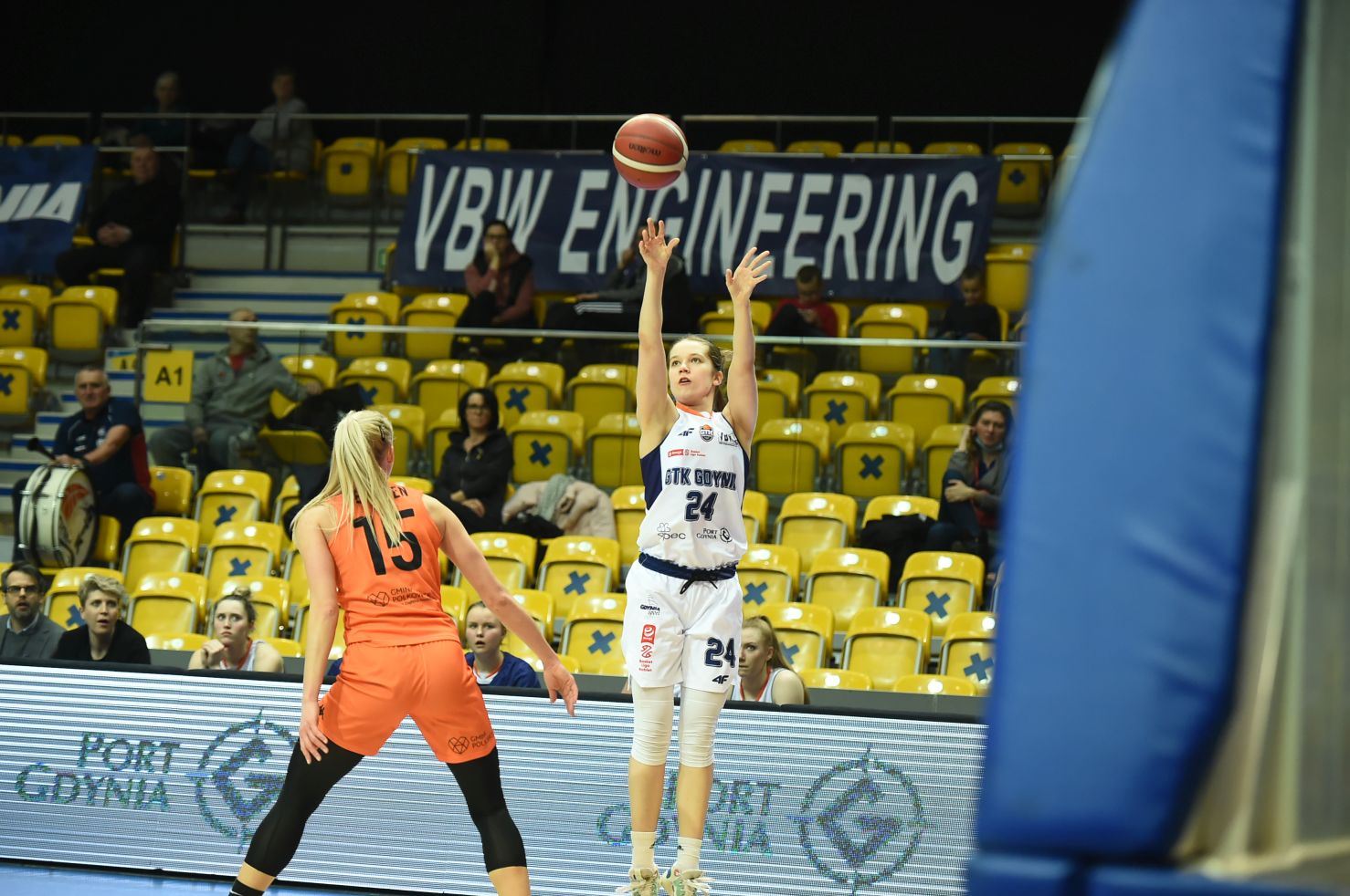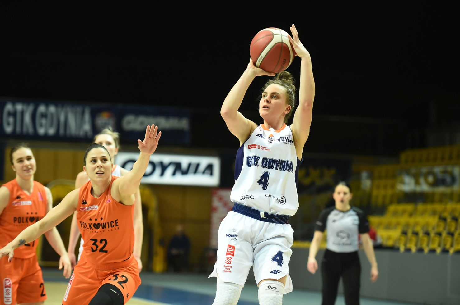 Dobrze dla zawodniczek Karoliny Szlachty rozpoczęła się zaległa 17 kolejka Energa Basket Ligi Kobiet. Po minucie gry, pierwsze punkty meczowe zdobyła Marta Marcinkowska. Po chwili Aleksandra Parzeńska dołożyła kolejne oczka i gdynianki wyszły na prowadzenie 6:2. W drugiej połowie pierwszej kwarty, polkowiczanki nadrobiły jednak zdobycz punktową i z akcji na akcję powiększały swoją przewagę. Trzy punkty celnym rzutem zza łuku odrobiła Julia Niemojewska (zdjęcie górne). Ciężko było gdyniankom przebić się przez obronę przeciwniczek. Młode Polki starały się wykorzystywać swoje szanse zza linii 6,75m – udało się to Joannie Kobylińskiej, Parzeńskiej i dwukrotnie Jowicie Ossowskiej.