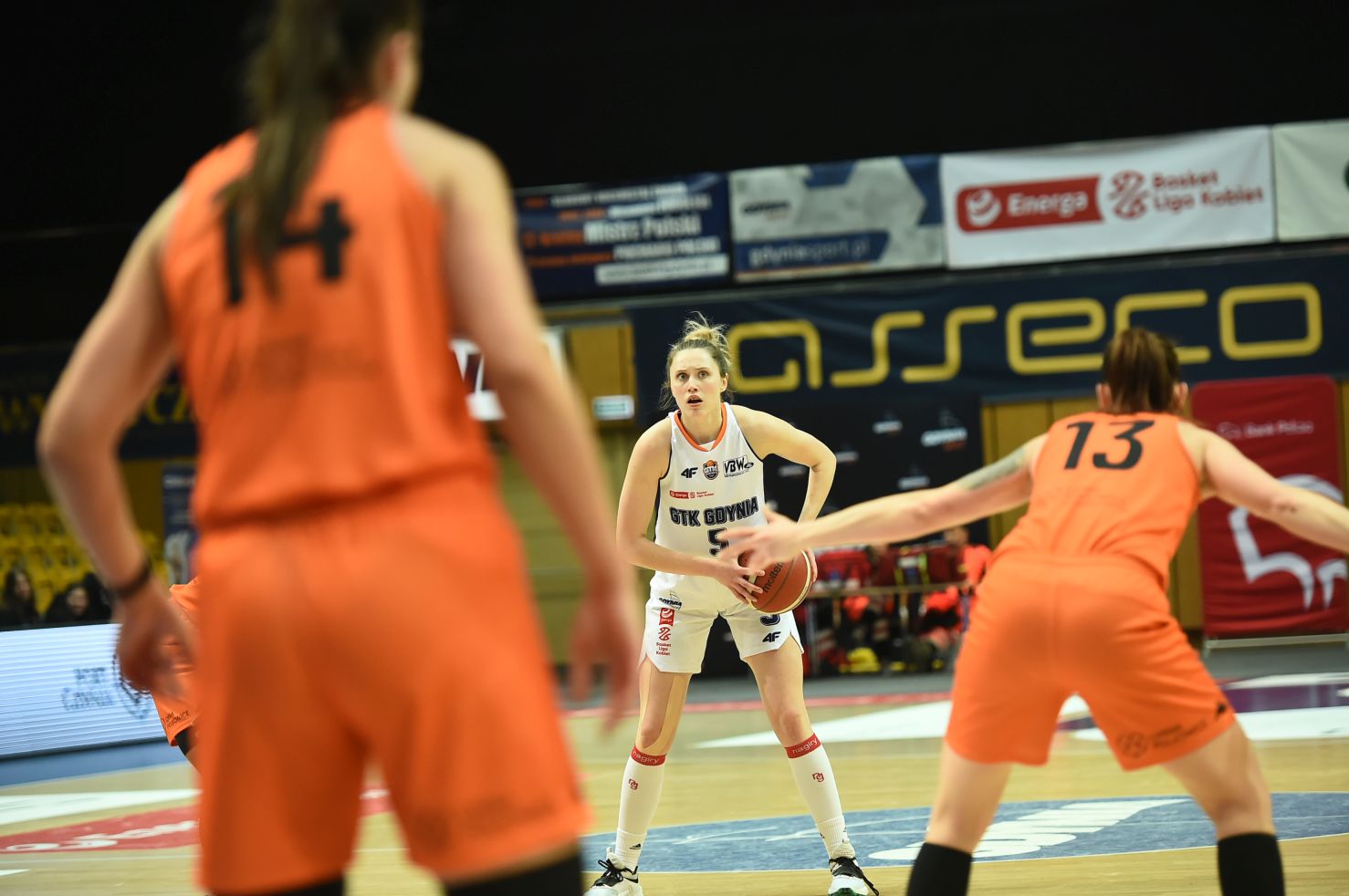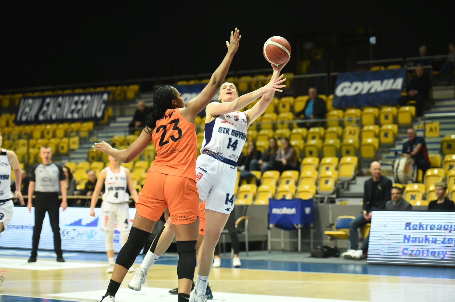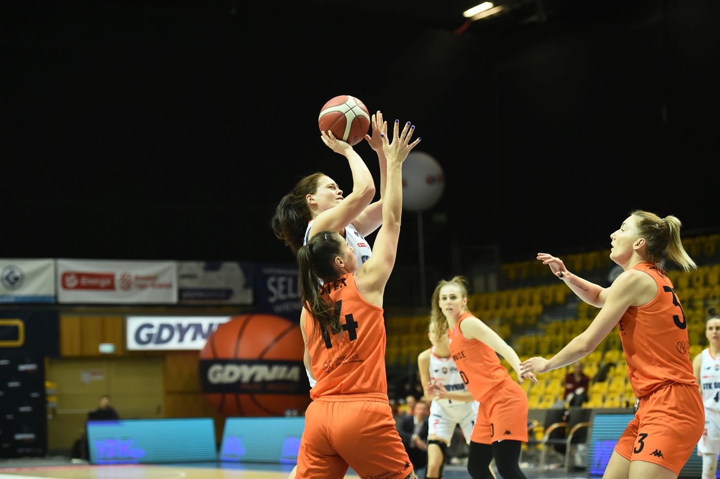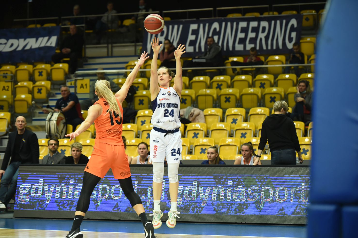 Dobrze dla zawodniczek Karoliny Szlachty rozpoczęła się zaległa 17 kolejka Energa Basket Ligi Kobiet. Po minucie gry, pierwsze punkty meczowe zdobyła Marta Marcinkowska. Po chwili Aleksandra Parzeńska dołożyła kolejne oczka i gdynianki wyszły na prowadzenie 6:2. W drugiej połowie pierwszej kwarty, polkowiczanki nadrobiły jednak zdobycz punktową i z akcji na akcję powiększały swoją przewagę. Trzy punkty celnym rzutem zza łuku odrobiła Julia Niemojewska (zdjęcie górne). Ciężko było gdyniankom przebić się przez obronę przeciwniczek. Młode Polki starały się wykorzystywać swoje szanse zza linii 6,75m – udało się to Joannie Kobylińskiej, Parzeńskiej i dwukrotnie Jowicie Ossowskiej.