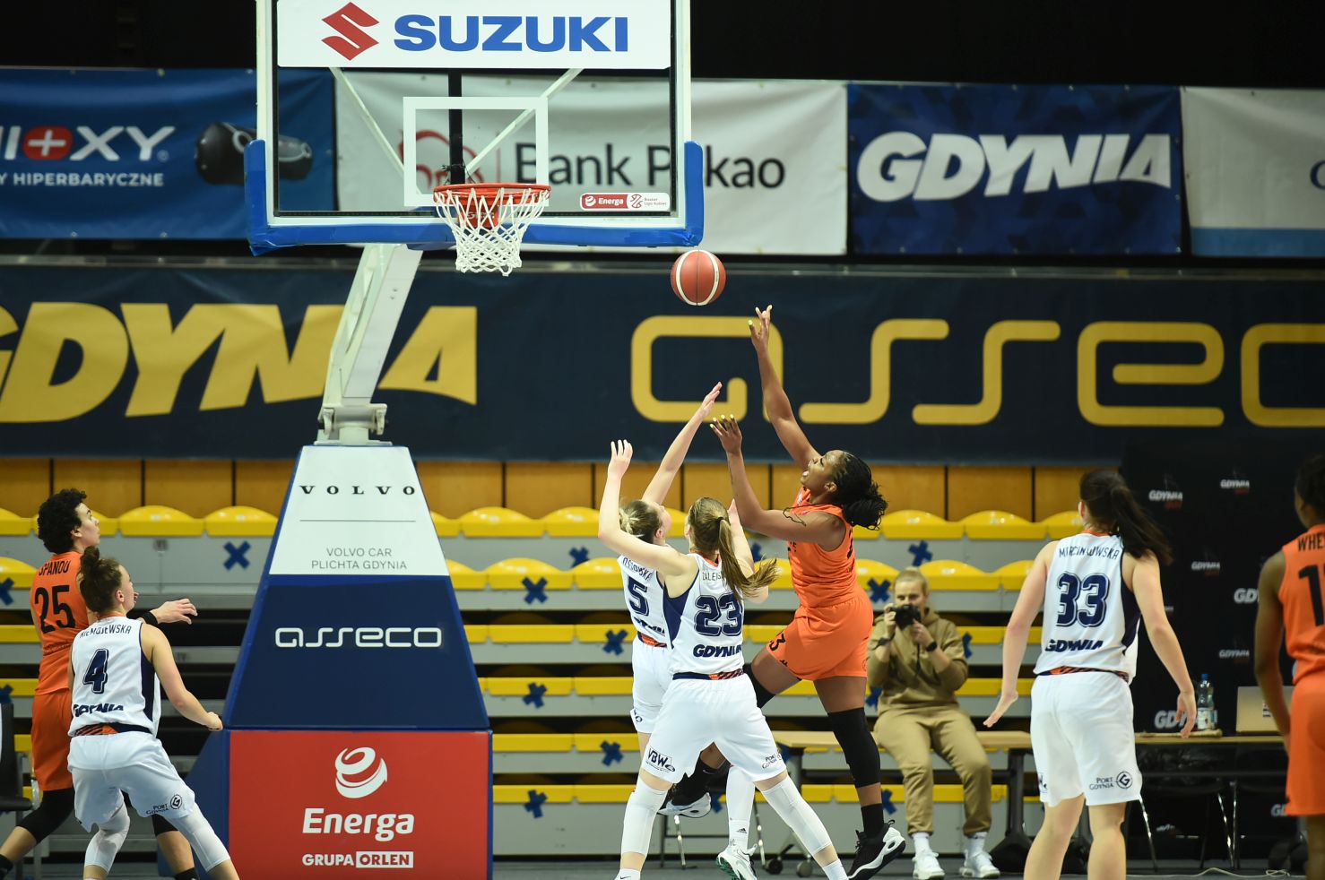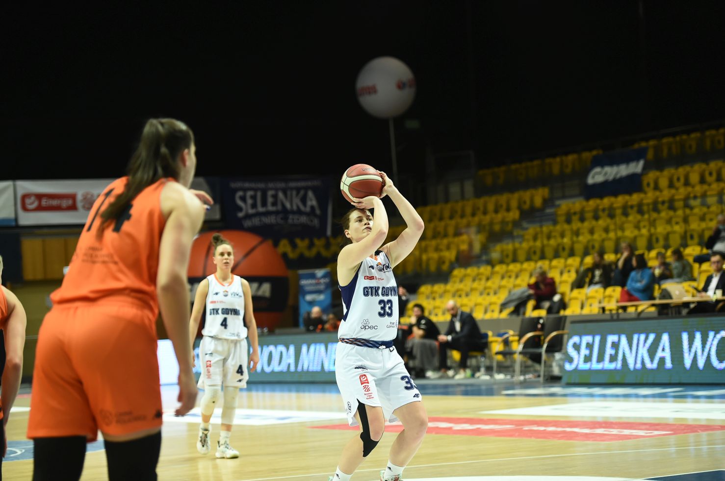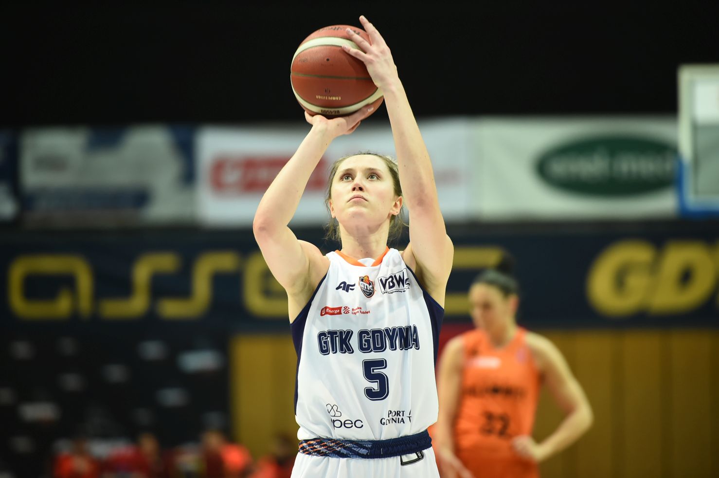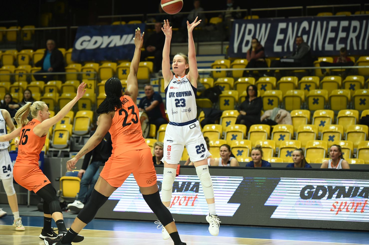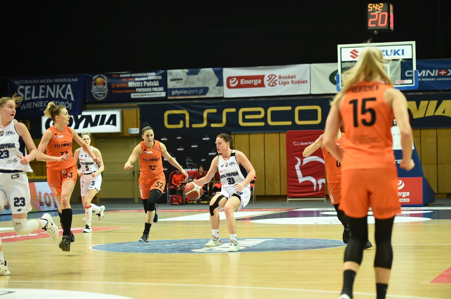 Dobrze dla zawodniczek Karoliny Szlachty rozpoczęła się zaległa 17 kolejka Energa Basket Ligi Kobiet. Po minucie gry, pierwsze punkty meczowe zdobyła Marta Marcinkowska. Po chwili Aleksandra Parzeńska dołożyła kolejne oczka i gdynianki wyszły na prowadzenie 6:2. W drugiej połowie pierwszej kwarty, polkowiczanki nadrobiły jednak zdobycz punktową i z akcji na akcję powiększały swoją przewagę. Trzy punkty celnym rzutem zza łuku odrobiła Julia Niemojewska (zdjęcie górne). Ciężko było gdyniankom przebić się przez obronę przeciwniczek. Młode Polki starały się wykorzystywać swoje szanse zza linii 6,75m – udało się to Joannie Kobylińskiej, Parzeńskiej i dwukrotnie Jowicie Ossowskiej.