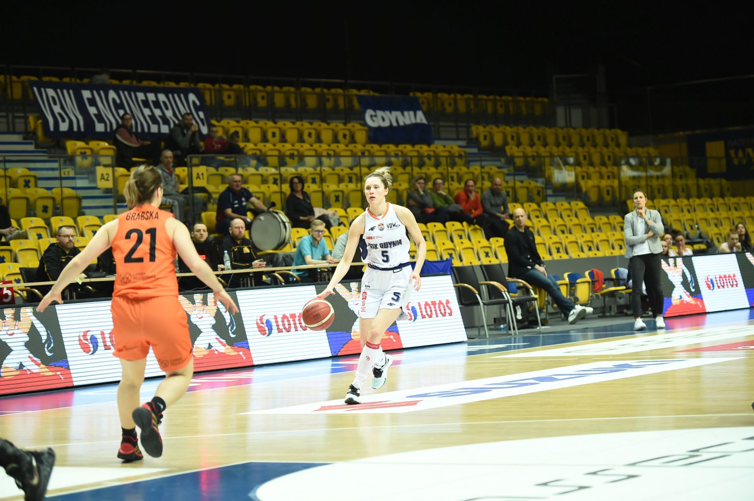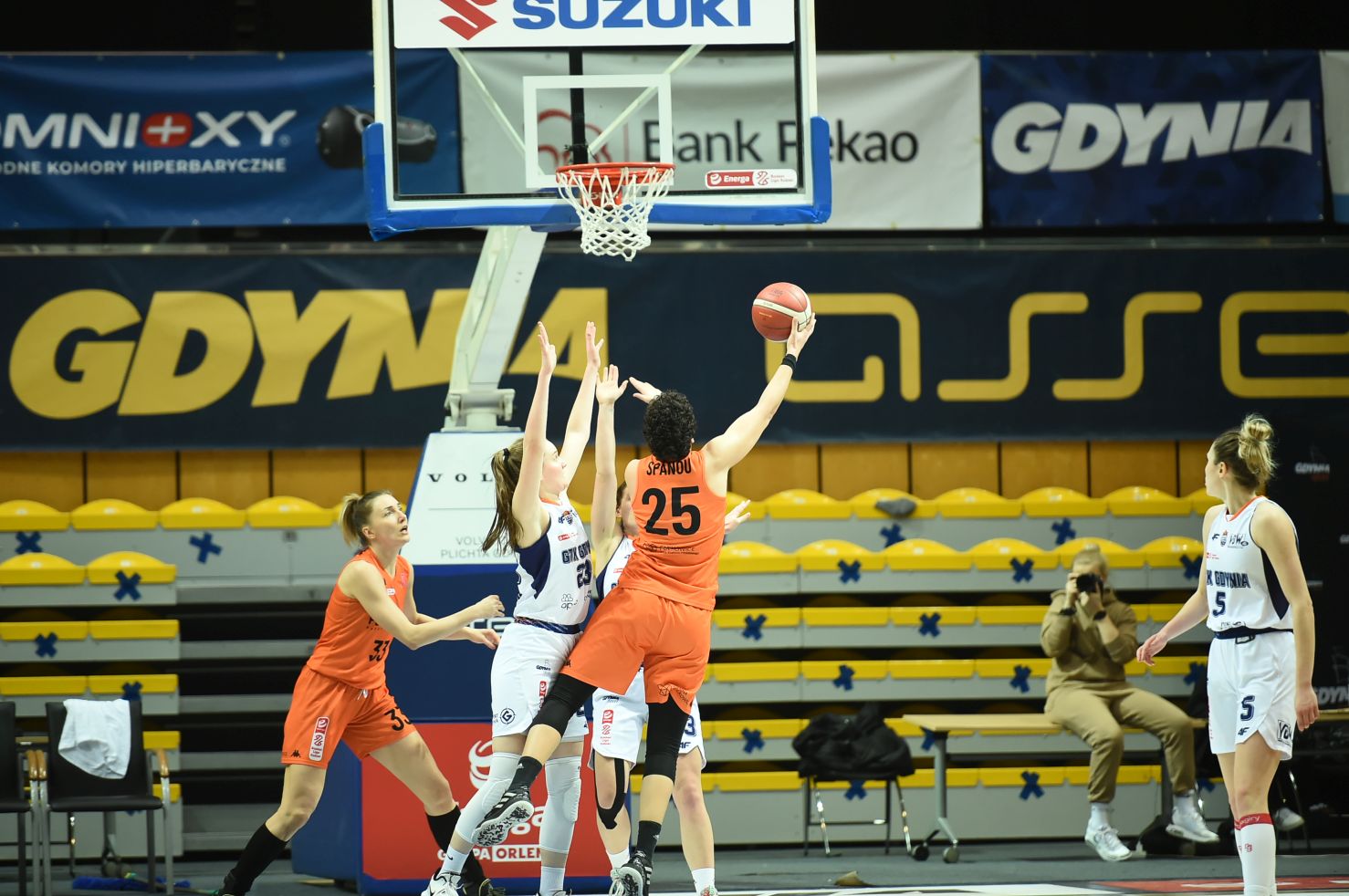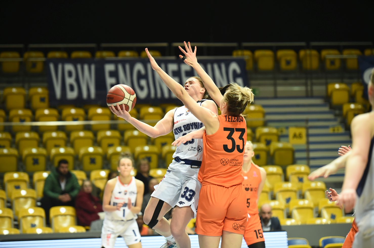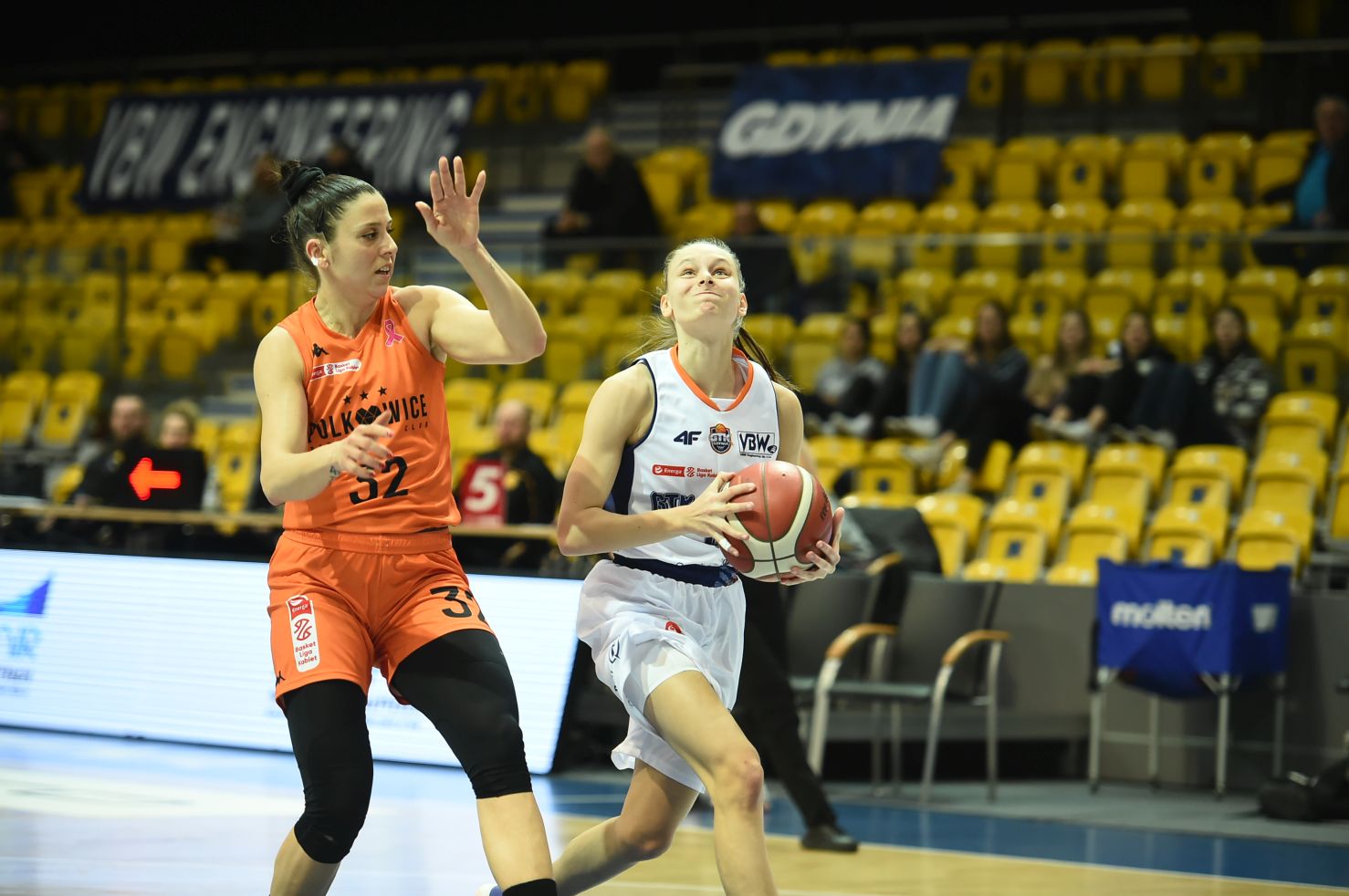 Dobrze dla zawodniczek Karoliny Szlachty rozpoczęła się zaległa 17 kolejka Energa Basket Ligi Kobiet. Po minucie gry, pierwsze punkty meczowe zdobyła Marta Marcinkowska. Po chwili Aleksandra Parzeńska dołożyła kolejne oczka i gdynianki wyszły na prowadzenie 6:2. W drugiej połowie pierwszej kwarty, polkowiczanki nadrobiły jednak zdobycz punktową i z akcji na akcję powiększały swoją przewagę. Trzy punkty celnym rzutem zza łuku odrobiła Julia Niemojewska (zdjęcie górne). Ciężko było gdyniankom przebić się przez obronę przeciwniczek. Młode Polki starały się wykorzystywać swoje szanse zza linii 6,75m – udało się to Joannie Kobylińskiej, Parzeńskiej i dwukrotnie Jowicie Ossowskiej.