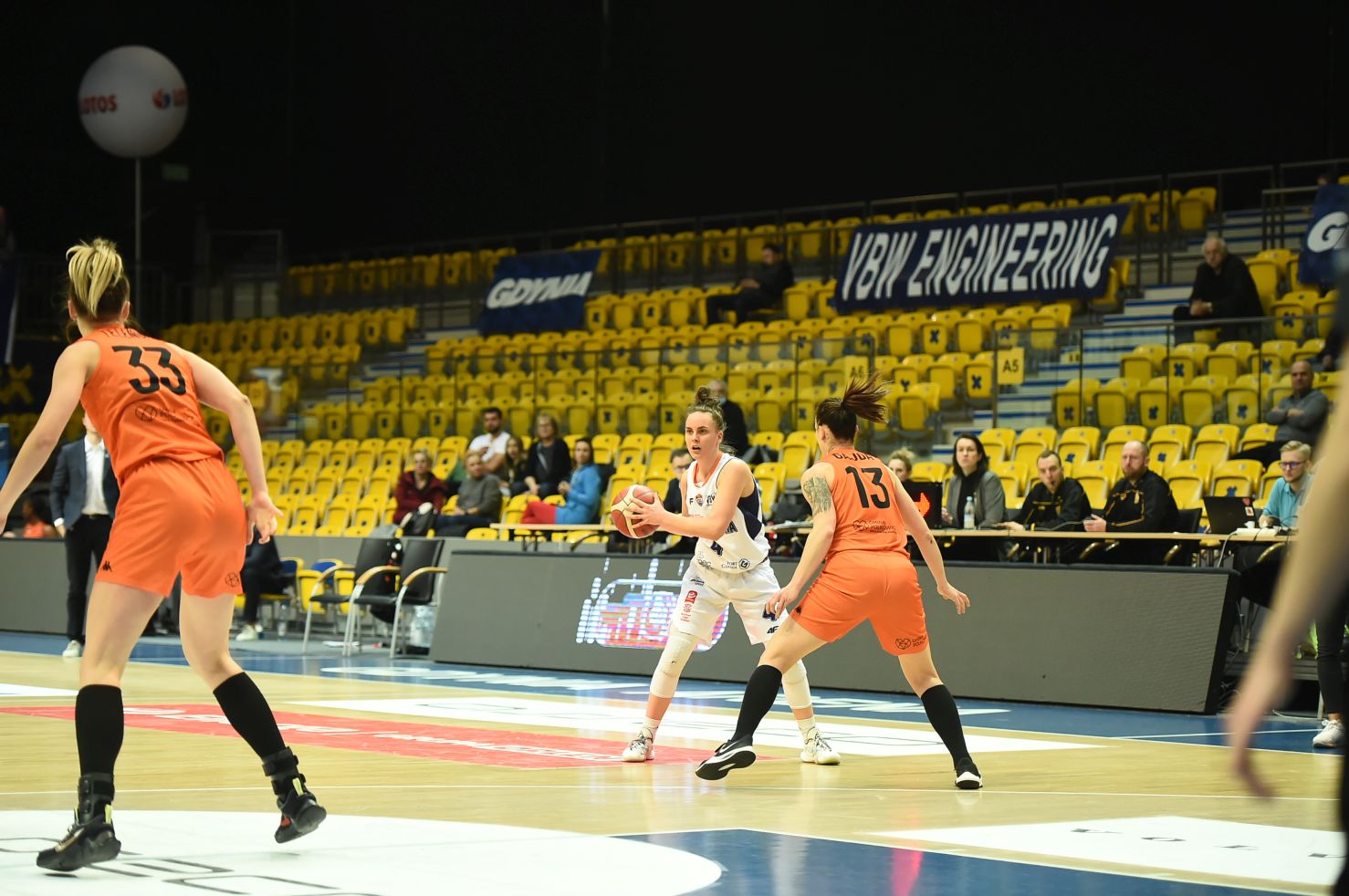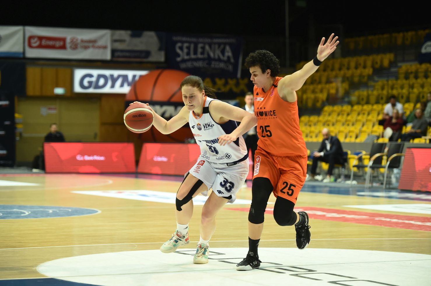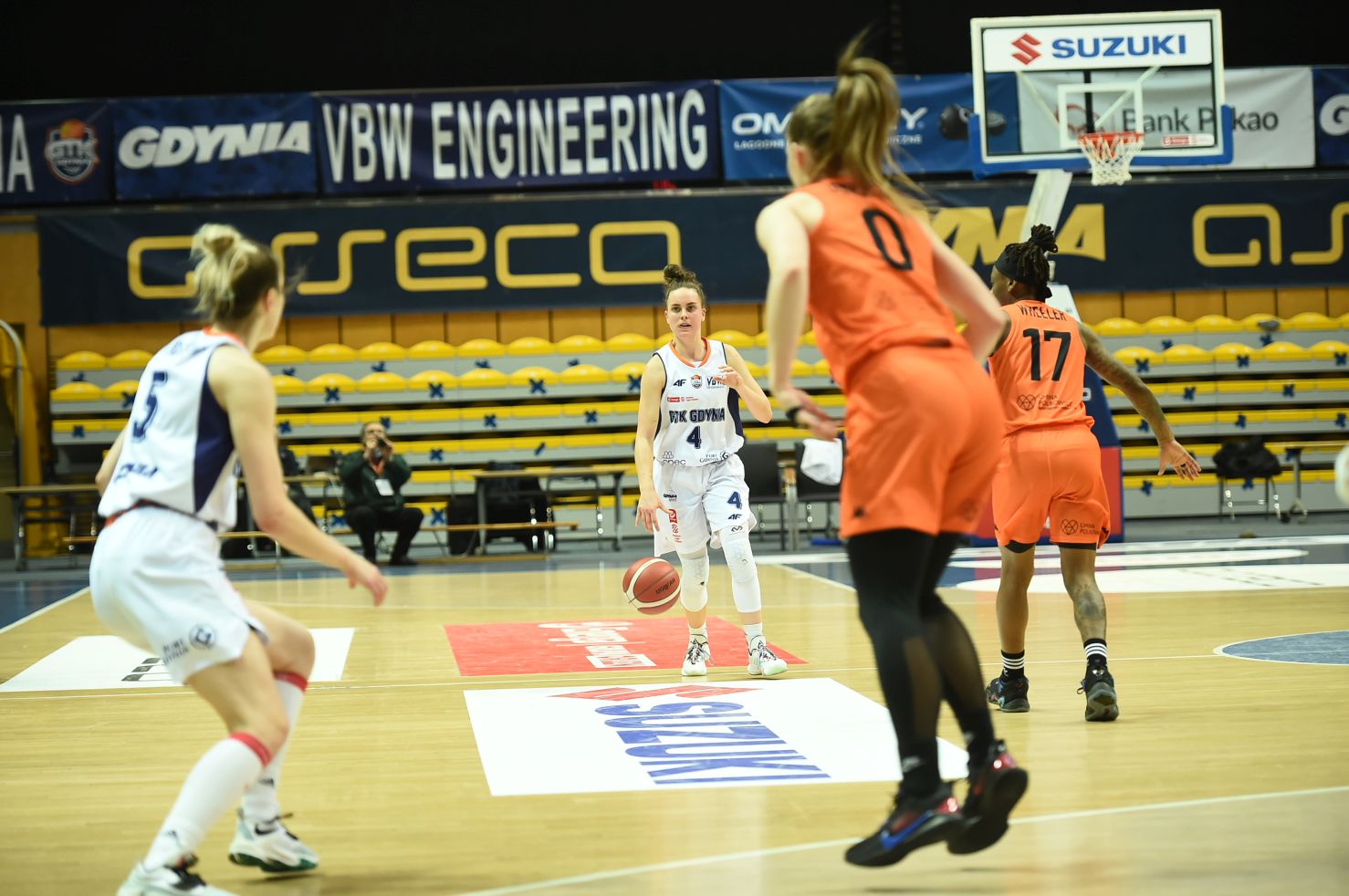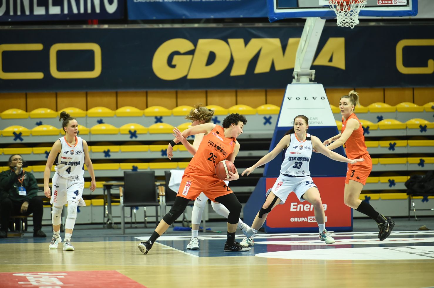 Dobrze dla zawodniczek Karoliny Szlachty rozpoczęła się zaległa 17 kolejka Energa Basket Ligi Kobiet. Po minucie gry, pierwsze punkty meczowe zdobyła Marta Marcinkowska. Po chwili Aleksandra Parzeńska dołożyła kolejne oczka i gdynianki wyszły na prowadzenie 6:2. W drugiej połowie pierwszej kwarty, polkowiczanki nadrobiły jednak zdobycz punktową i z akcji na akcję powiększały swoją przewagę. Trzy punkty celnym rzutem zza łuku odrobiła Julia Niemojewska (zdjęcie górne). Ciężko było gdyniankom przebić się przez obronę przeciwniczek. Młode Polki starały się wykorzystywać swoje szanse zza linii 6,75m – udało się to Joannie Kobylińskiej, Parzeńskiej i dwukrotnie Jowicie Ossowskiej.
