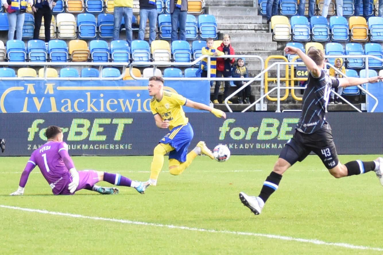 63 – powinno być 3:2 dla Arki. Szybki atak gdyńskiej drużyny, po dokładnym podaniu Haydary’ego, powinien skutecznym strzałem zakończyć Czubak, ale jego uderzenie znakomicie odbił Pęksa.