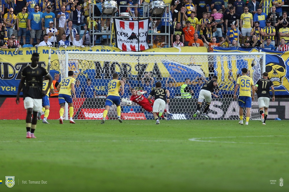 78′ – Efthymis Koulouris (Pogoń) wykonuje strzał z rzutu karnego, który broni Damian Węglarz (Arka)